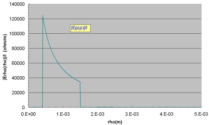 discussion of this). The component of radial electric field Eρ(ρ) is shown below with a magnified view showing the field penetration into the outer dielectric region. In the conductors