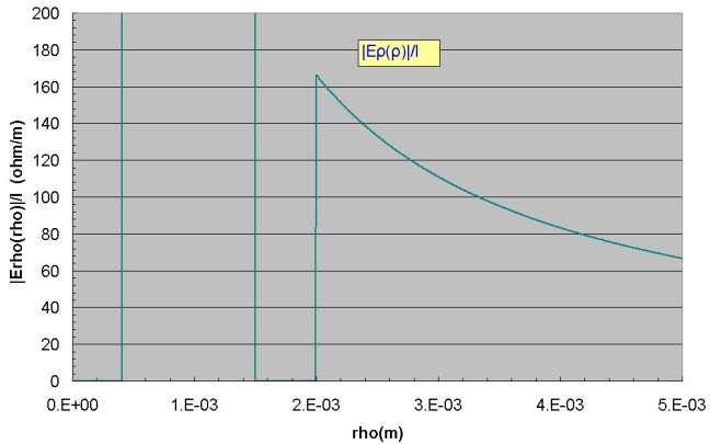 the radial electric field is extremely small (~ 1e-9 ohm/m for this example) compared to the axial electric field of ~ 1e-3 ohm/m in the outer conductor. Conversely, in
