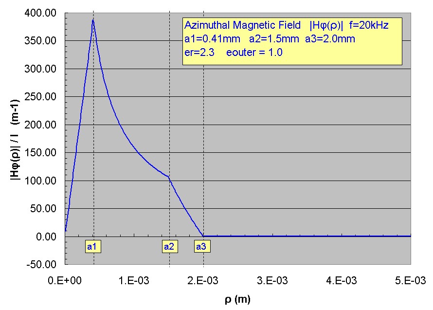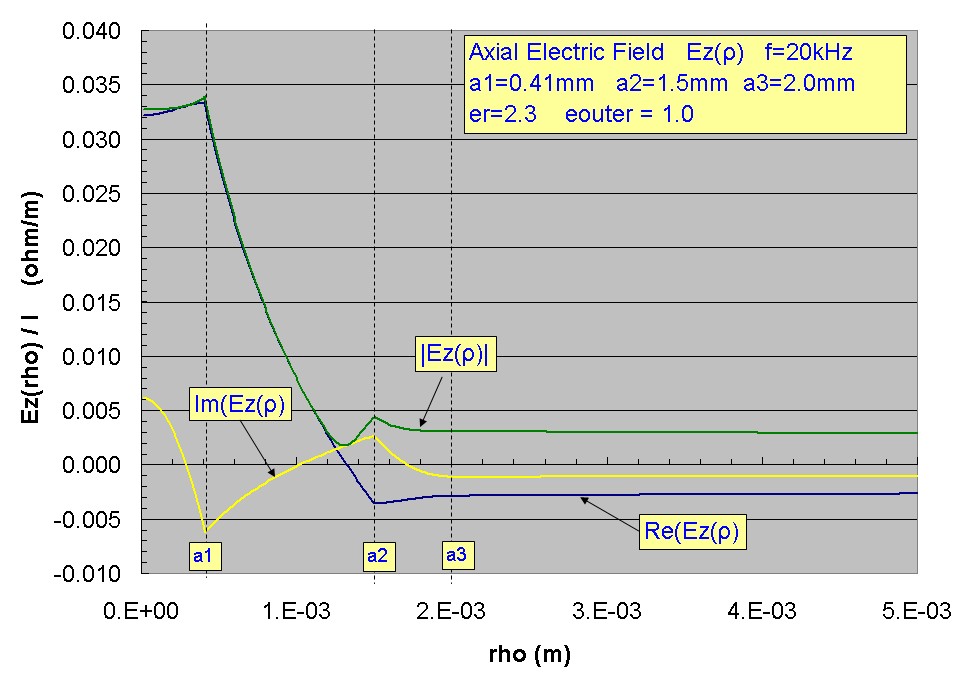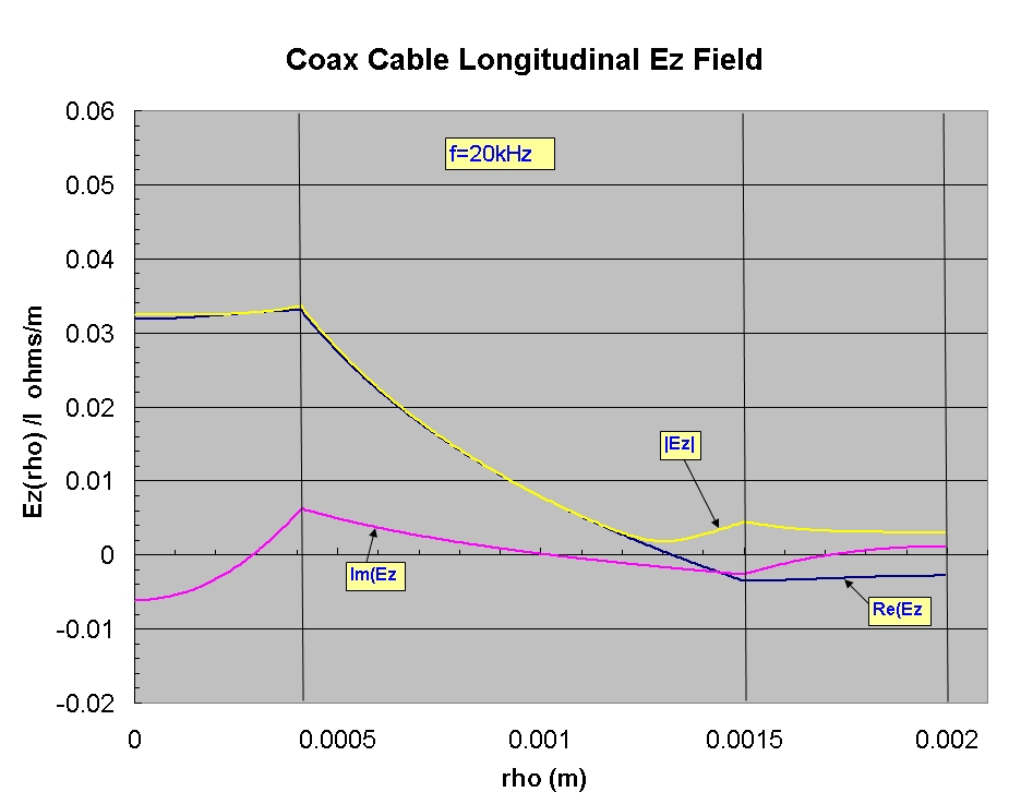 above for 20kHz demonstrate field leakage outside the coax, since the Ez field is continuous across the boundary, but the limitation in the formalism doesn't permit a proper prediction of the fields OUTSIDE the coaxial cable.