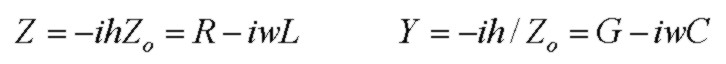 where Z is the distributed series impedance (ohms/m) which consists of real and imaginary parts representing the line distributed series resistance and line distributed series inductive reactance.