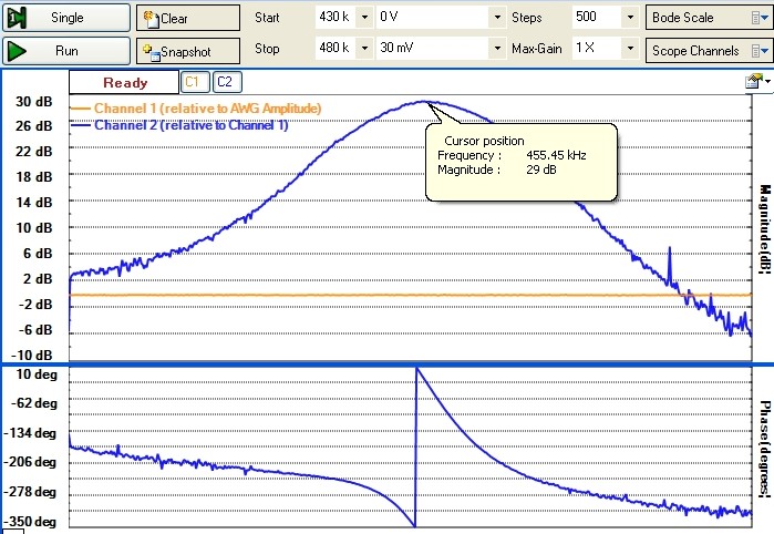 The Bode plot below shows the tuned IF stage response.