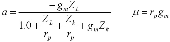 Standard small-signal gain analysis (Brophy, 1966) provides the voltage gain: