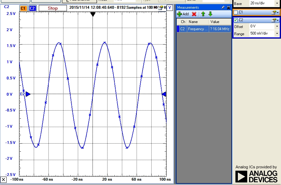 in the absence of a generator, it is sometimes useful to be able to quickly configure a single frequency fairly high-quality stable sine wave oscillator at a frequency beyond 10MHz. The simple example below demonstrates a stable