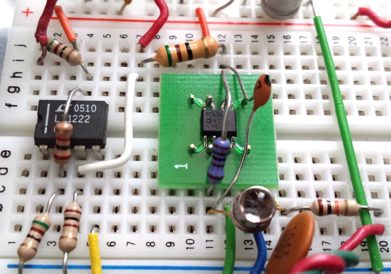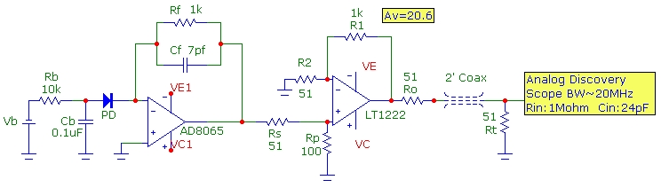 followed by a voltage amplifier non-inverting gain stage using a 500MHz LT1222 op-amp with a gain of 20.6. The photodiode is a Vishay BPW24R