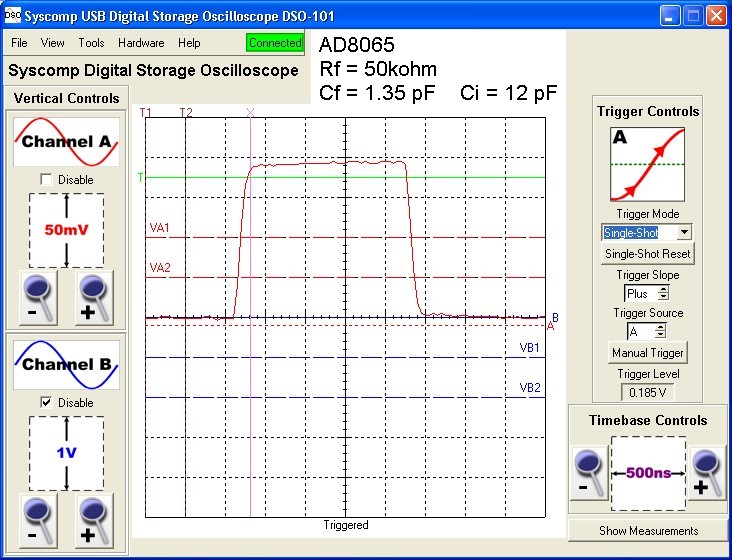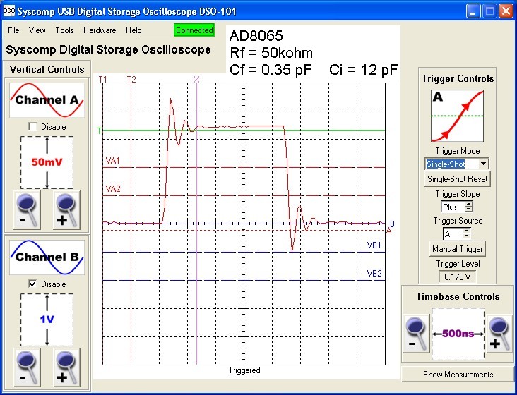The scope traces below show the transient response of the transimpedance circuit with Cf= 1.35 pF and Cf = 0.35 pF (with the 1pf capacitor disconnected). The fall-time