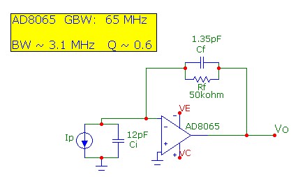 Circuit modelling predicts a -3dB transimpedance bandwidth of 3.1 MHz with a Q of 0.6, slightly more heavily damped