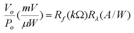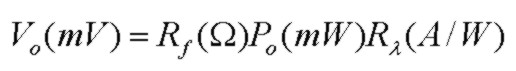 where Rλ is the optical-wavelength dependent photodiode Responsivity in units of A/W (or equivalently mA/mW), Rf is the transimpedance feedback resistance in ohms, and Po is the optical