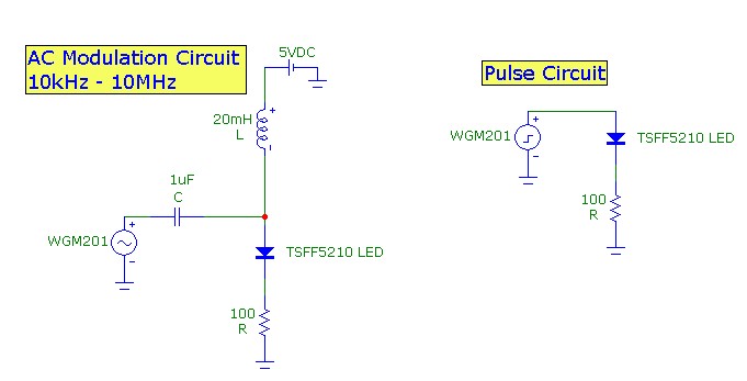 A 24 MHz Vishay TSFF5210 IR-LED emitting at a wavelength of 870 nm,. with rise/fall time capability of 15 ns was used for optical speed characterization. For AC modulation bandwidth measurements,