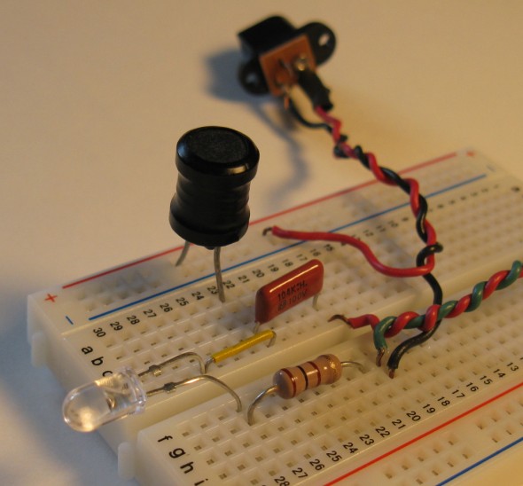 The scope trace below shows the output voltage from the transimpedance circuit, with the LED positioned and biased approximately as described above and modulated at 40% at 1 MHz: