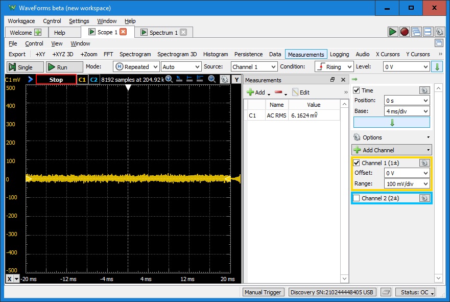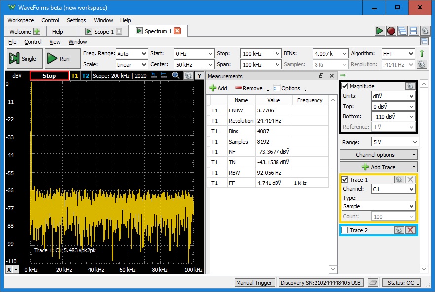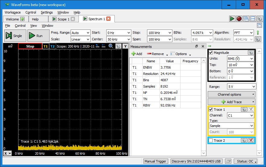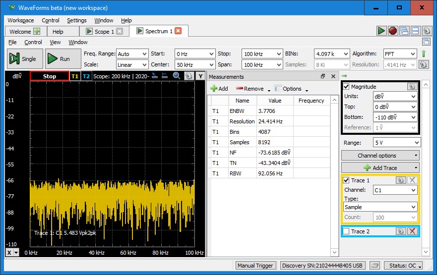 The screen shots below show (1) the noise floor (TN ~ -43dBV or 6.7mVrms) of the Analog Discovery test configuration (without the input noise source