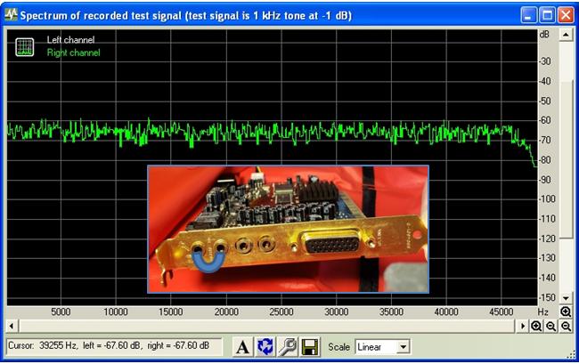 The Right Mark Audio Analyzer traces below show the 1kHz test signal alone, with a very low noise floor of the sound card (within the 46kHz noise bandwidth) and low harmonic