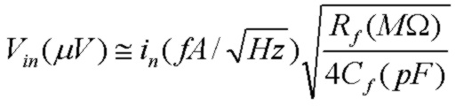 This summary page provides formulae for the exact and approximate output voltage noise for the transimpedance circuit shown to the right.