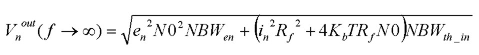 where en and in are the op-amp spectral voltage and current noise densities, N0 is the DC noise gain, Kb is Boltzmann's constant, T is the absolute