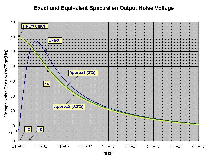 The plot below shows the exact output spectral voltage noise density for en and the equivalent single-pole-like spectral noise density with cutoff frequencies Fc for approx1 and (Fc-Fz)