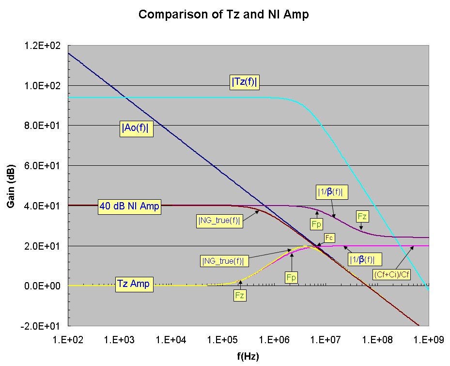 With reference to the plots above, it is seen that the shape of the noise-gain (1/β) curve is different than that of the transimpedance circuit. This is because the lowering of Ri