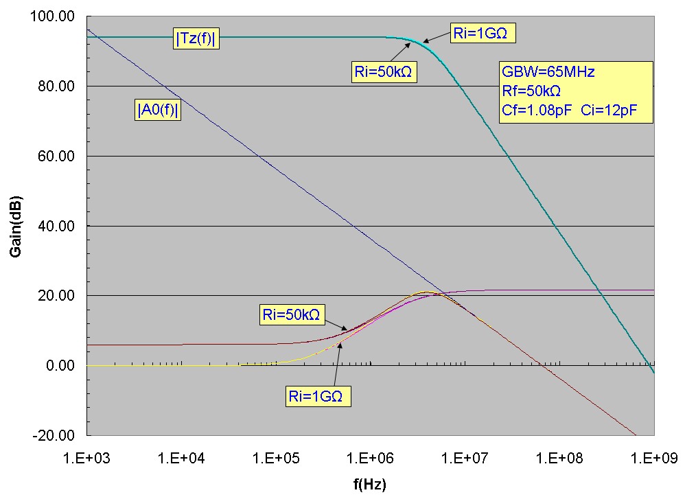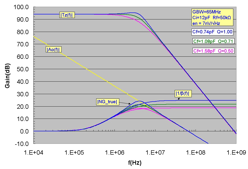 The graph below shows the open-loop gain, transimpedance, true noise gain and noise gain (1/beta) for the three Cf values. The true noise-gain, i.e. the complete noise gain