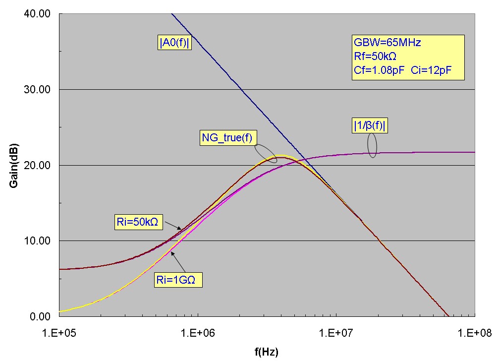 higher frequency and the resultant true noise-gain curves in the main contributing spectral region are almost identical for the two Ri values. It is important to remember that typical gain plots use logarithmic