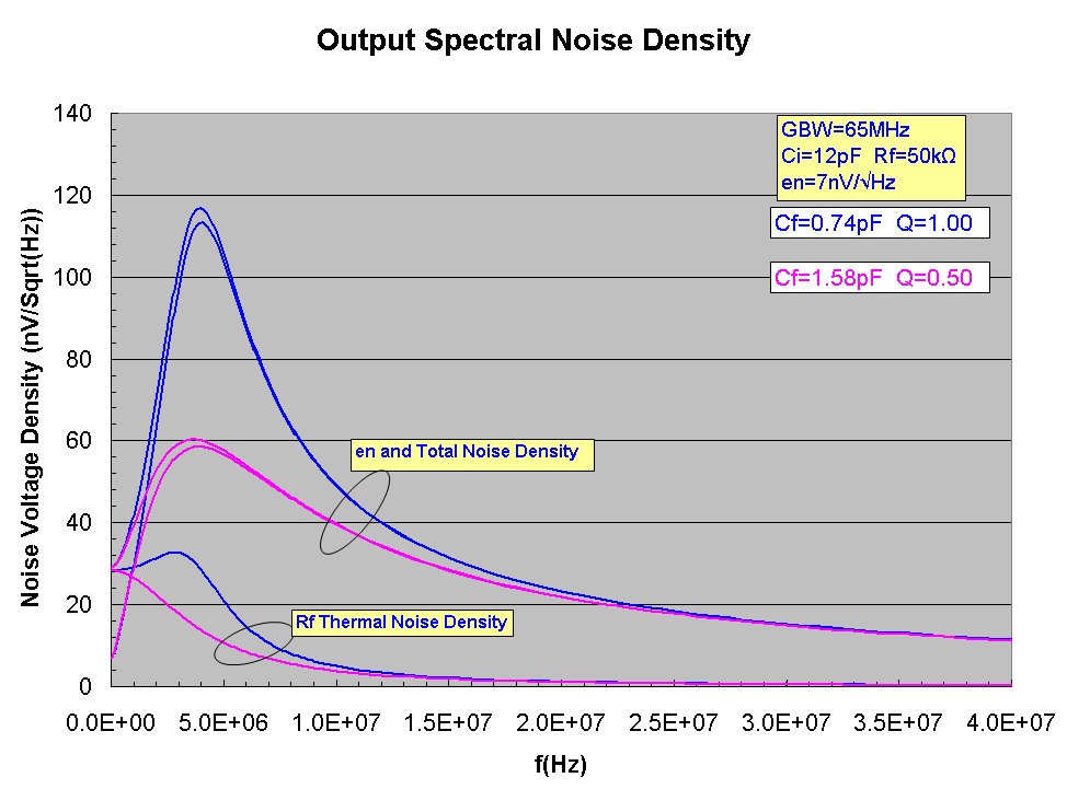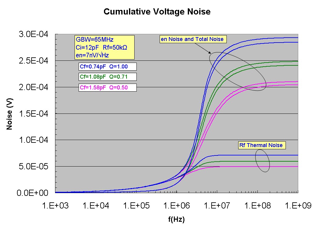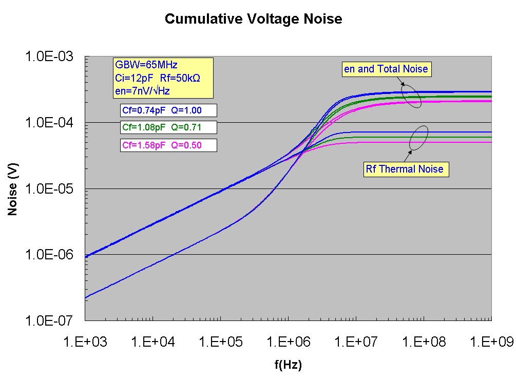 voltage noise contribution "overtakes" the thermal noise contribution, a direct result of the noise-gain peaking experienced by en but not by the thermal Rf noise source.