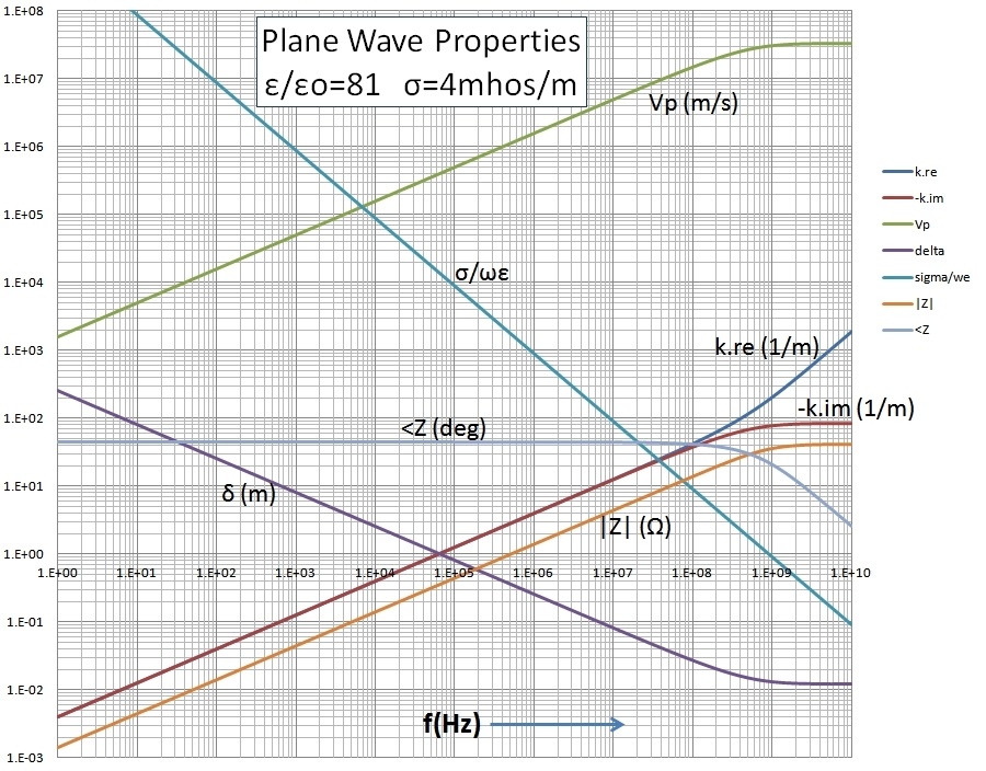 The graph below shows the calculated EM plane wave properties over a frequency range of 1 Hz to 10 GHz for typical salt water (assuming the dielectric constant and permittivity are constant over this range).