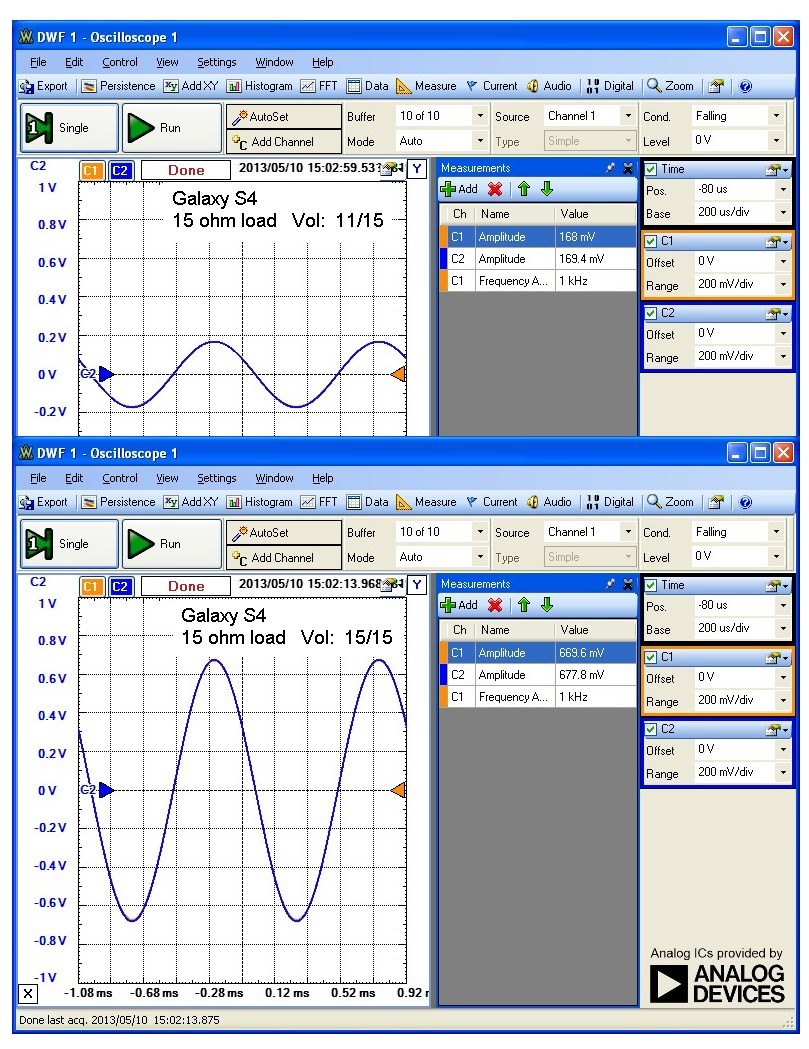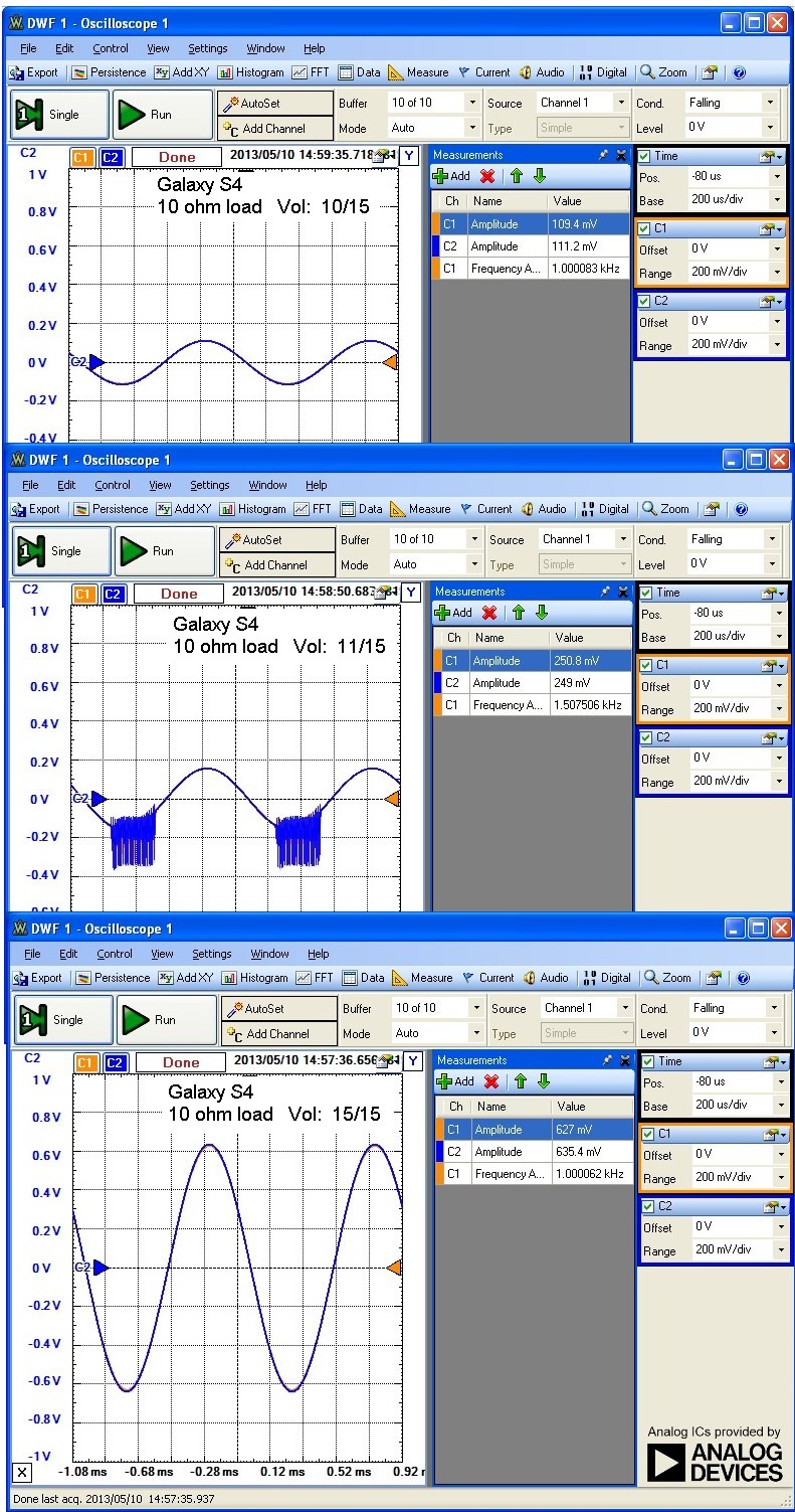 The fact that the Samsung Galaxy S3 unit that I tested does NOT show this oscillation instability points to an output headphone driver stage design artifact which in my opinion should