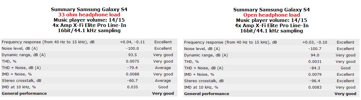 when the S4 headphone output is connected to a high-quality external headphone amplifier terminated with the same 33 ohm load resistors.
