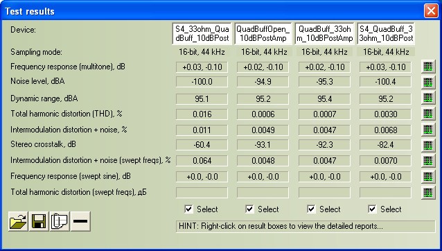 columns 2 and 3 represent the combined noise and distortion of the sound card line-out, the external headphone amplifier and the sound card line-in. The results in columns 1 and 4