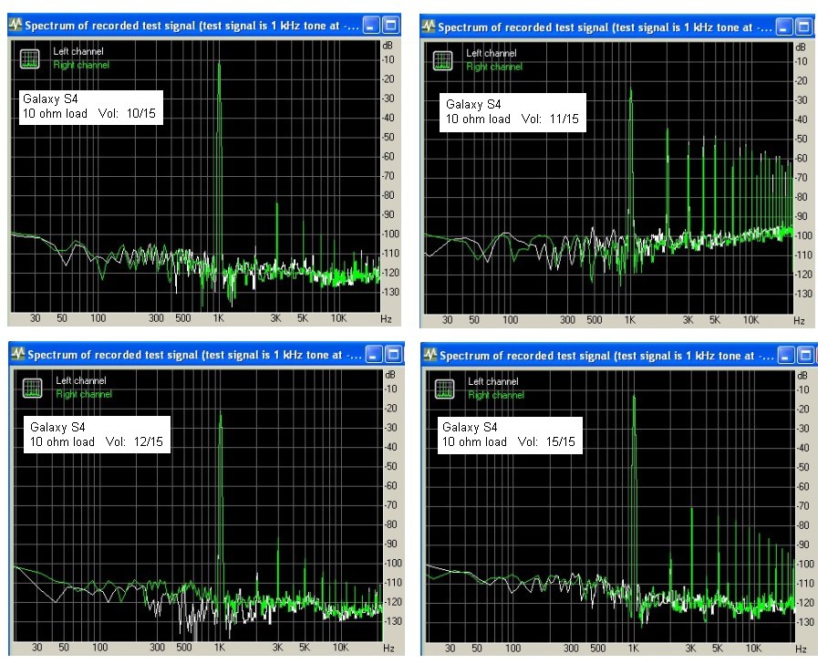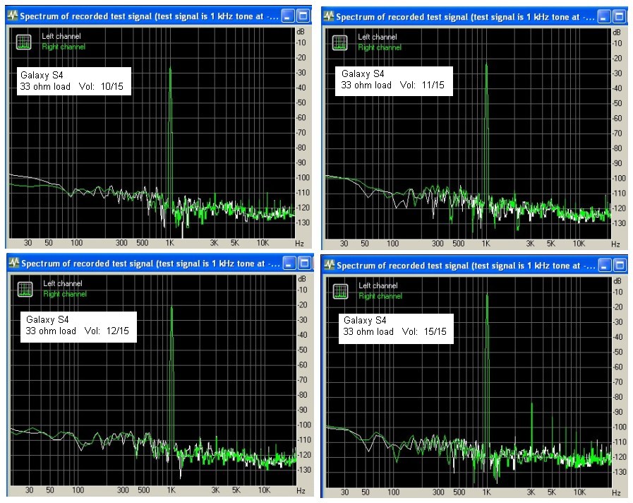 the S4 Music player amplitude and headphone load were varied. The plots below show headphone output spectral content for the 1 kHz test tone track at different S4 Music player levels for headphone loads of 10 ohm and 33 ohm for pure sine wave playback as above.