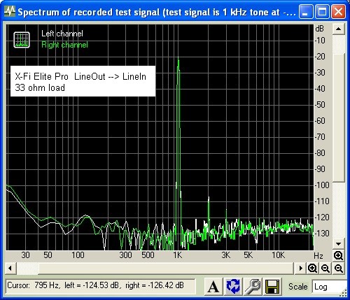 For comparison, the spectral content using only the X-Fi Elite pro sound card with LineOut --> LineIn shows a very low noise floor demonstrating the measurement capability in this setup.