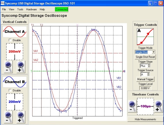 adjusted to provide about unity gain, with an input signal of about 900mVpeak. The output signal (blue) shows the characteristic soft "squashing"