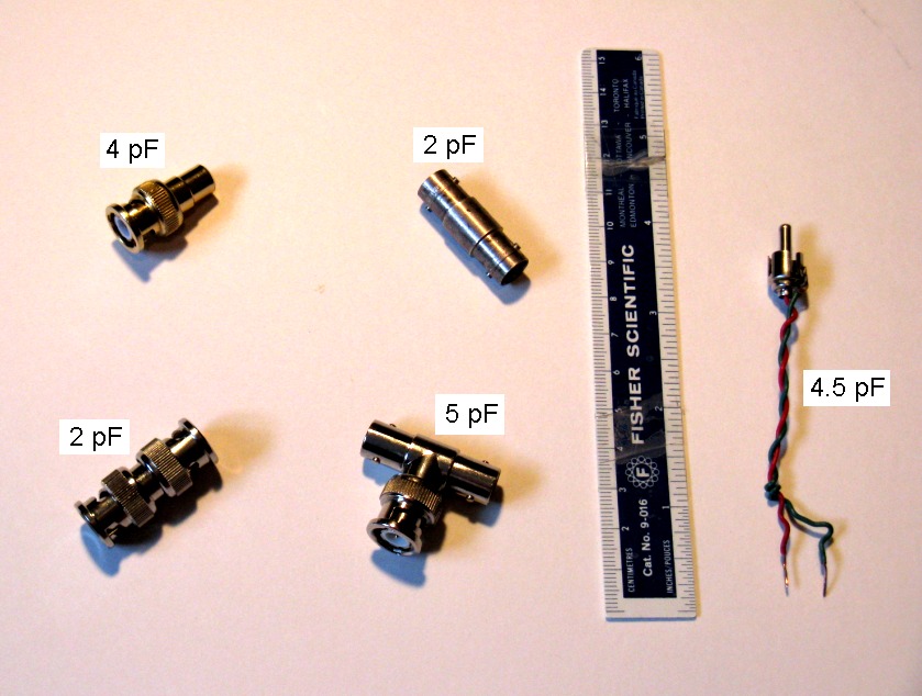 The capacitance values of some BNC connectors are shown below. Standard RG58a/U 50ohm test cable has a capacitance of 30 pF/foot.