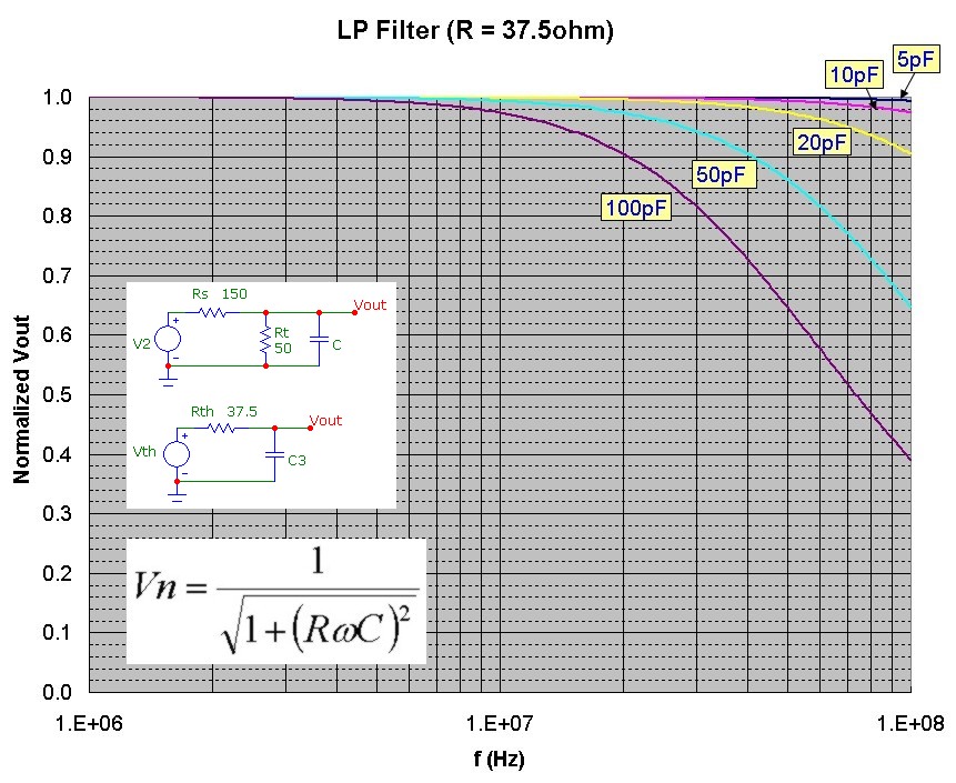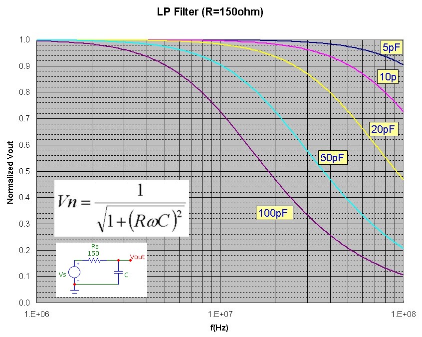 capacitance, the following 2 graphs show the effect of load capacitance on the normalized voltage output (assuming a load with much higher resistance than the 150 ohm generator resistance).