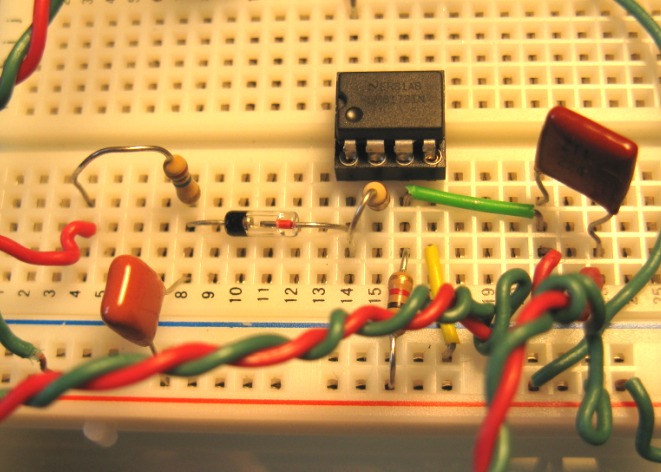 Since this op-amp has a fairly high input bias current of 1.5uA, a 1 kohm +input termination resistor was used to ensure negligible output voltage offset driving the half-wave rectifier output.