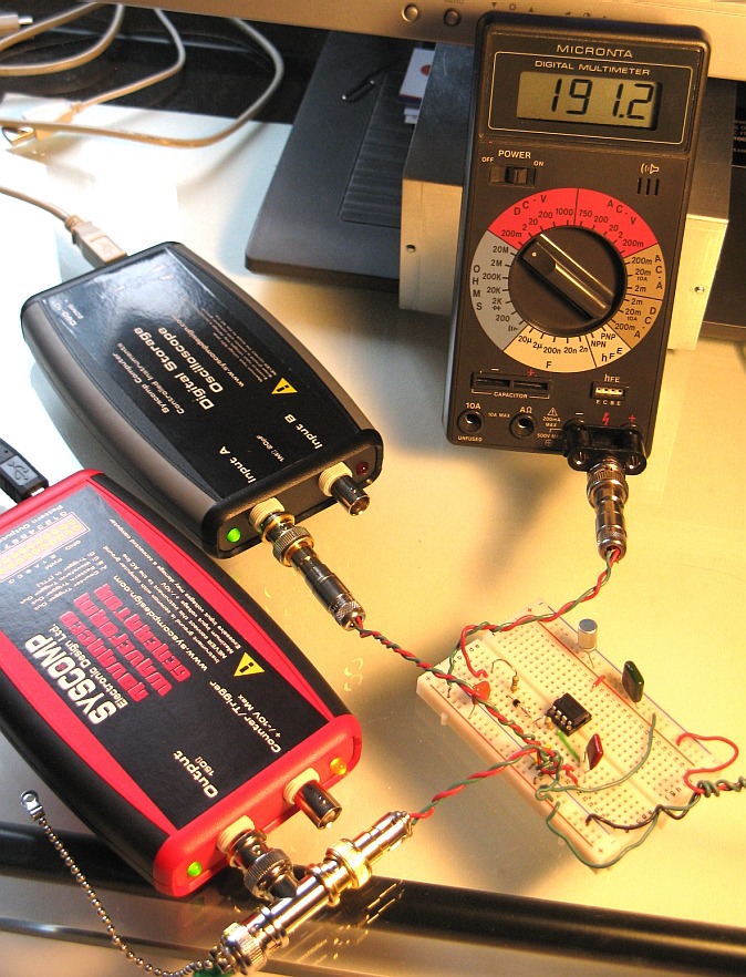 a 10 Mohm resistor and a standard 10 Mohm input DVM measuring DC voltage. The accuracy of the DVM ranges was checked using a 0.1% precision DC voltage reference IC.