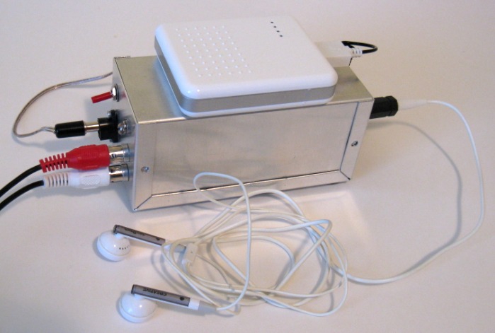 Proto-board layout in shielded box. Stereo inputs (left) with both RCA and 1/8" mini-phone stereo jacks.