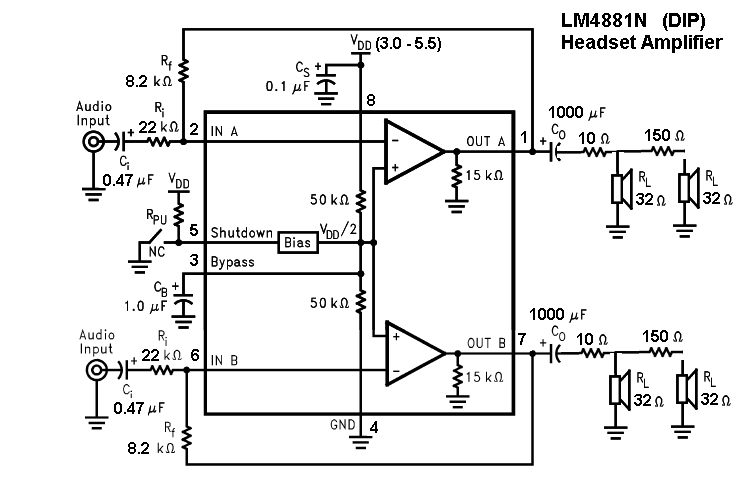 This note describes a stereo headset amplifier using the National LM4881 amplifier chip. The circuit described is suitable for driving