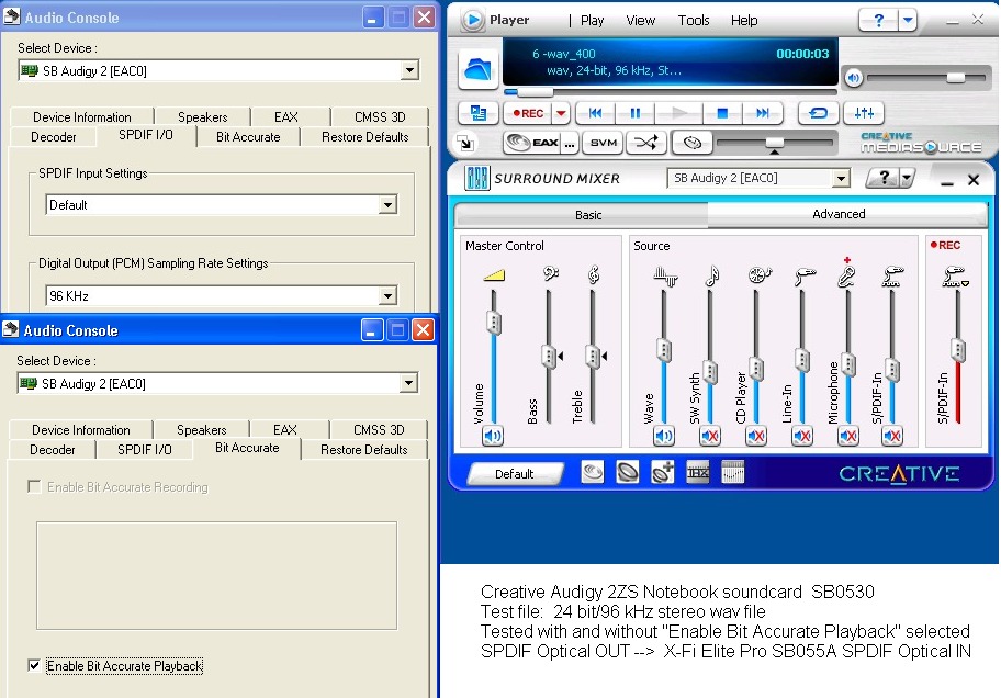 for the two tests is the Enable Bit Accurate Playback setting for the Audigy 2ZS card is set to enabled
