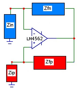 where Zip, Zfp are the noninverting input and feedback complex impedances as shown below:
