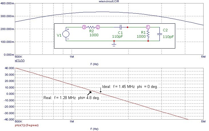 Wien feedback capacitors, the predicted oscillation frequency drops to about 1.45 MHz, still well above the measured frequency.